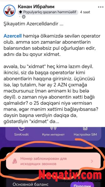 Tribunainfo.az xəbər verir ki, narazı və şikayətçi gənc Kənan İbrahim bu barədə Feysbuk sosial şəbəkəsində yazıb. O bildirib ki, “Azercell” artıq abonentlərin balansından səbəbsiz pul oğurluqları edir, adını da qoyur xidmət:
