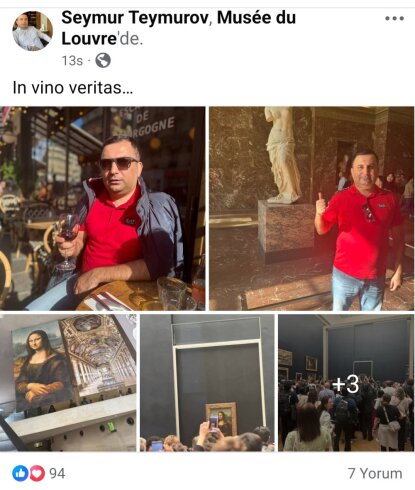 Gəlin başlayaq... Fransanın paytaxtı Parisdə yerləşən Louvre Muzeyi (Musée du Louvre) önündə əlində qırmızı şərab olan fotosuna S.Teymurov həmin fotoya “In vino veritas” (“Şərabda həqiqət var”) sözlərini qeyd edib.
