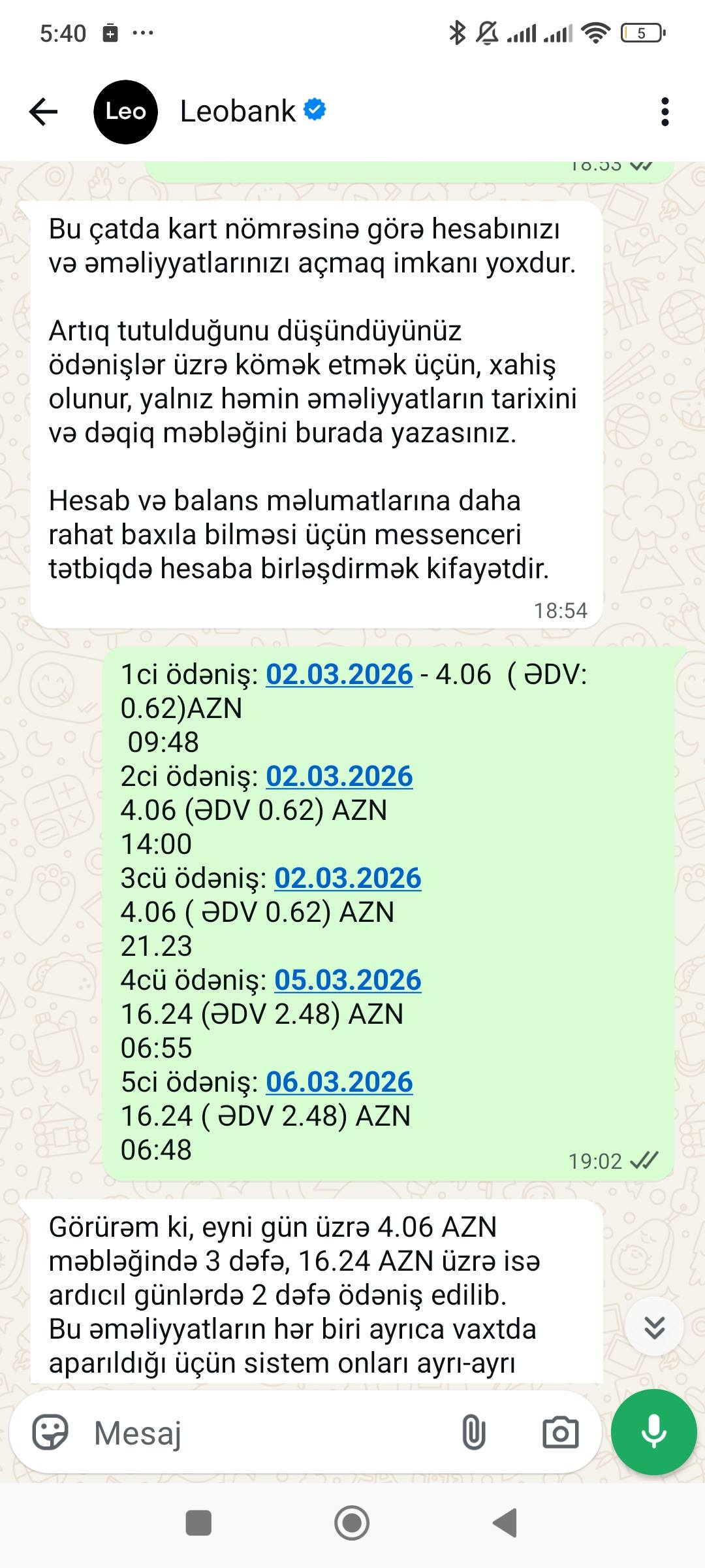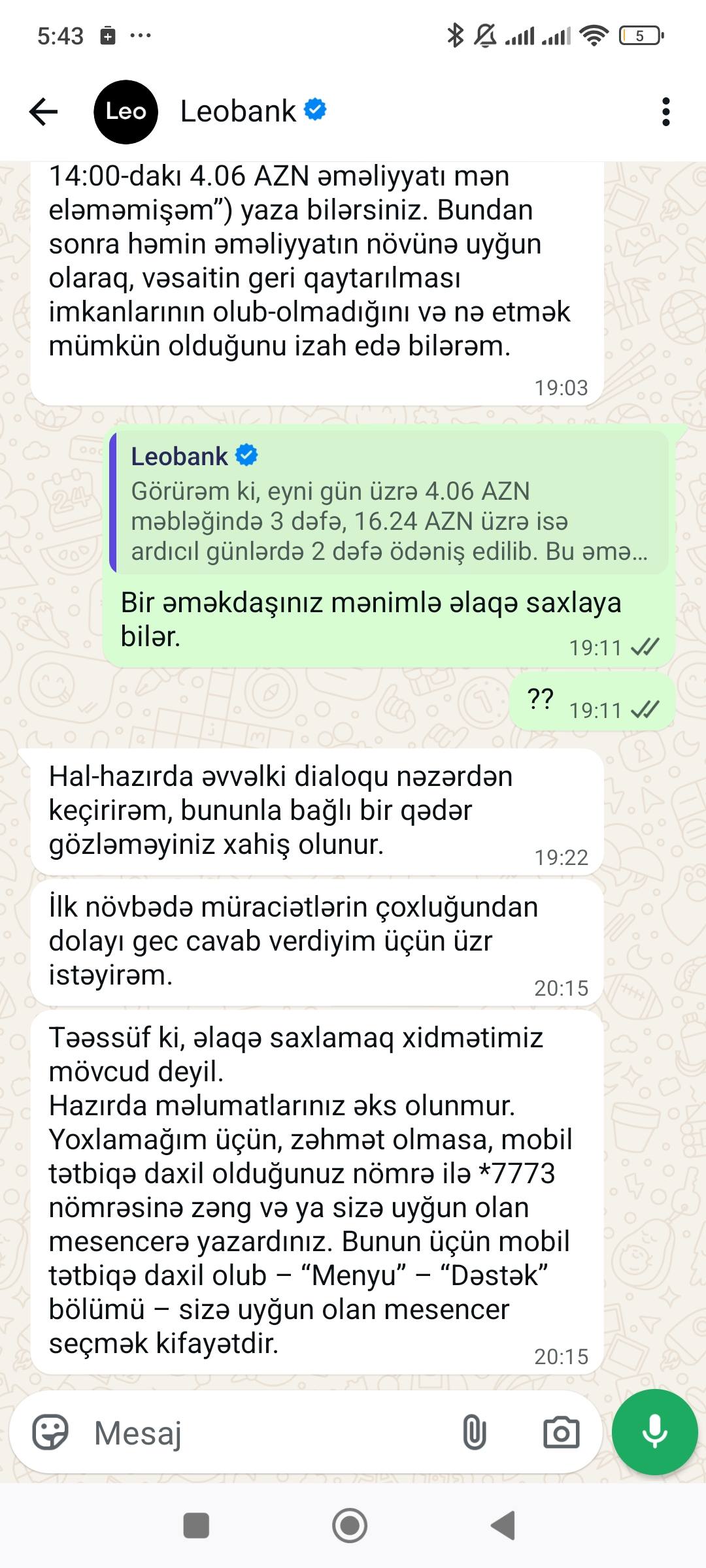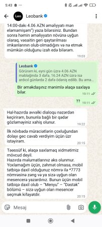 "Unibank" təqdim elədiyiniz, "Leobank" yeni növ xidmətidir xəbərimiz yoxdur? Dəstək xidmətinə yazıram, deyirəm ki, əməkdaşınıza deyin, məsələni həll edək. Deyir ki, siz zəng edin..."