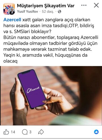 Şikayətçi Yusif Yusifov bütün abonentləri “Azərcell”i məhkəməyə verməyə çağırıb.XALQ xəbər verir ki, bu barədə şikayətçi sosial şəbəkədə yazıb. O bildirib ki, xətt gələn zənglərə açıq olduğu halda “Azərcell” ASAN imza təsdiqi, OTP və bildiriş SMS-lərini bloklayır: “Hansı əsasla bloklayır? Bütün narazı abonentlər, toplaşaraq “Azercell”i müqavilədə olmayan tədbirlər gördüyü üçün məhkəməyə verərək təzminat tələb edək”.