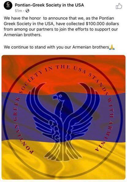 ABŞ-dakı Pont Yunanları Cəmiyyəti (Pontian Greek Society, PGS) sadəcə, "erməni qardaşlara dəstək" məqsədilə "Himnadram" saytındakı hesablara 100 min dollar köçürdüyünü bəyan edib.