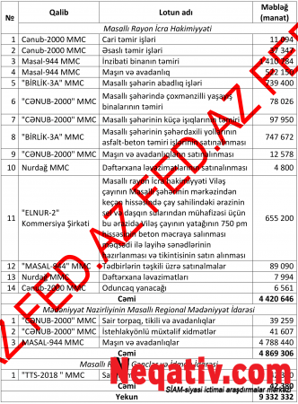 Dia.az-ın məlumatına görə, İcra hakimiyyəti 14 tenderə 4 milyon 420 min 646 manat xərcləyib. Masallıda Rayonun İcra Hakimiyyətinin keçirdiyi ən böyük tenderin qalibi Masal-944 MMC (1 milyon 410 min 784 manat) olmuşdur.