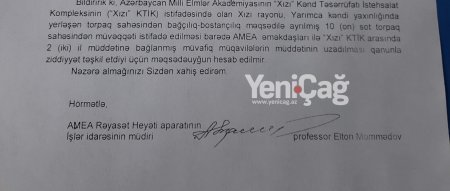 Milli Elmlər Akademiyasının (AMEA) prezidenti, akademik Ramiz Mehdiyev qurumun 500-dən çox əməkdaşına verilmiş “Xızı” Kənd Təsərrüfatı İstehsalat Kompleksinin istifadəsində olan Xızı rayonu, Yarımca kəndi yaxınlığında yerləşən bağ sahələrinin əllərindən alınması ilə bağlı göstəriş verib.
