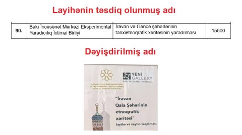 Bu qənaətə gəlməyimizə səbəb olan faktlardan biri də 2025-ci ilin qrant qalibləri sırasında yer alan Bakı İncəsənət Mərkəzi Eksperimental Yaradıcılıq Birliyi ilə bağlıdır. QHT-lərə Dövlət Dəstəyi Agentliyinin rəsmi elan etdiyi nəticələrdə bu təşkilatın qalib olduğu layihənin adı açıq-aydın göstərilib: “İrəvan və Gəncə şəhərlərinin tarixi etnoqrafik xəritəsinin yaradılması”. Yəni iki şəhəri əhatə edən, miqyaslı və iddialı bir layihə. Bu layihəyəyə görə də 15 500 manat dövlət vəsaiti ayrılıb.