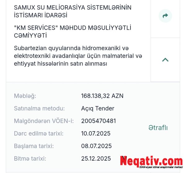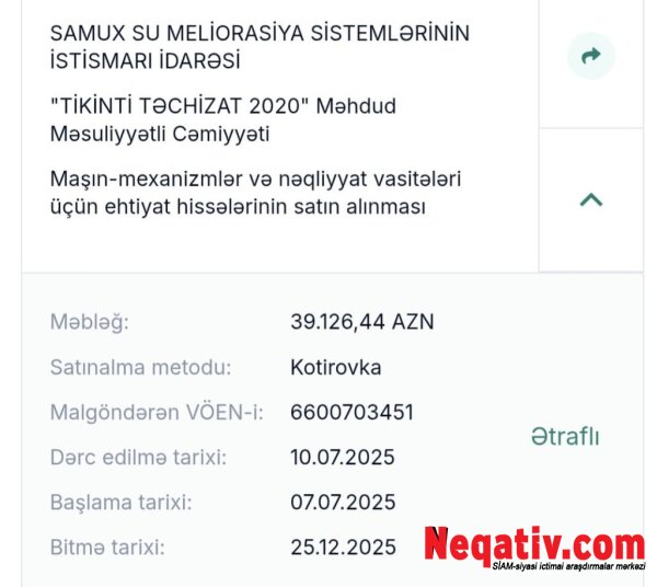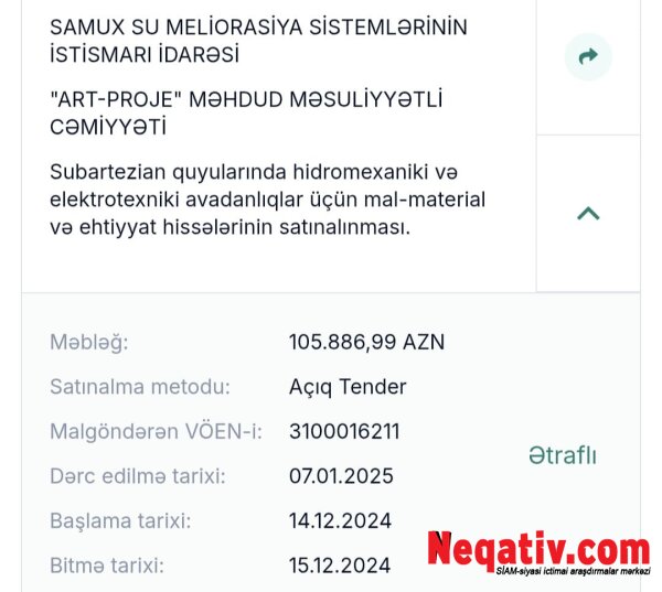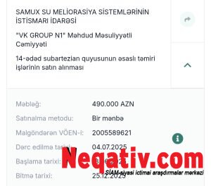 Samux Su Melorasiya Sistemlərinin İstismarı İdarəsi 800 min manatlıq tenderi diqqət çəkir.