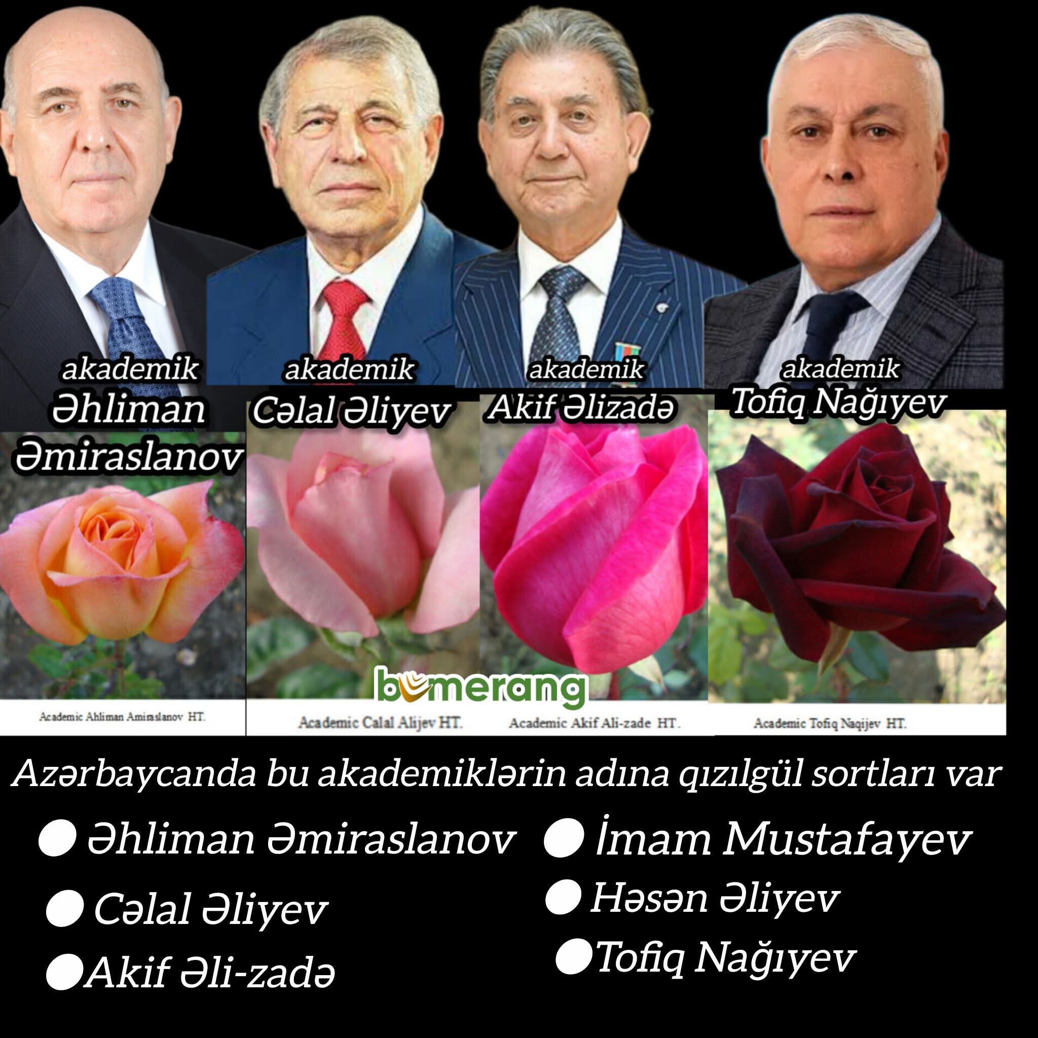 Digər sort Azərbaycan Milli Elmlər Akademiyasının sabiq prezidenti, geoloq akademik Akif Əlizadənin adını daşıyır. Sortun adı " Akademik Akif Əli-zadə"Bir başqa sort Mirşahin haqda çıxışına görə əbədi rəhmət qazanan mərhum akademik Cəlal Əliyevdir. Sortun adı " Akademik Cəlal Əliyev"Adının qızılgülə verildiyi digər akademik isə 1968-ci ildən 1987-ci ilə kimi Azərbaycan Milli Elmlər Akademiyasının Coğrafiya İnstitutuna başçılıq etmişdi Həsən Əliyevdir. Sortun adı " Akademik Həsən Əliyev"Daha bir akademik Tofiq Nağıyevin də adı qızılgül sortuna verilib.Sortun adı " Akademik Tofiq Nağıyev"Botanik, Azərbaycan Milli Elmlər Akademiyasının həqiqi üzvü akademik İmam Mustafayevin də adı Azərbaycanda yardılan qızılgülün yeni sortuna verilib...Bir sözlə... Gül kimi akademiklərimiz var imiş... Bilməmişik...Müəllif: Elçin Rəhimzadə - Mənbə: "DİA-AZ"