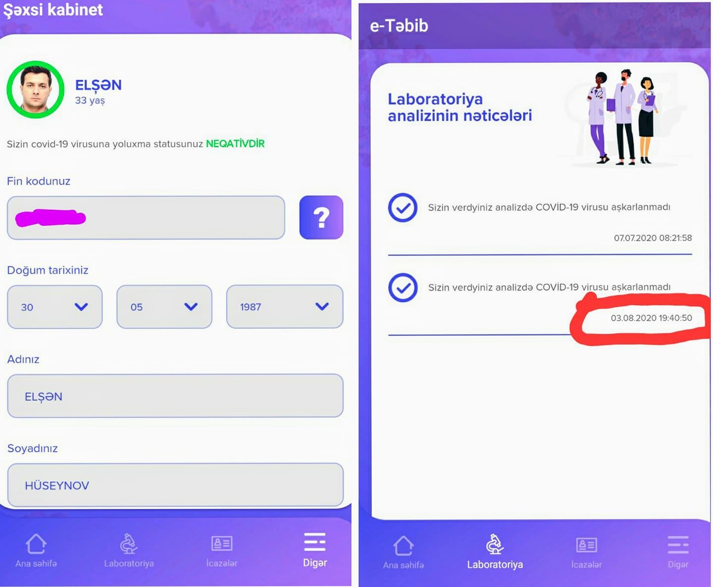 Avqust ayının 4-də koronavirus testi verən Elşən Hüseynsoy, bununla bağlı nəticənin 3 avqust tarixi ilə ona göndərildiyini bildirib.