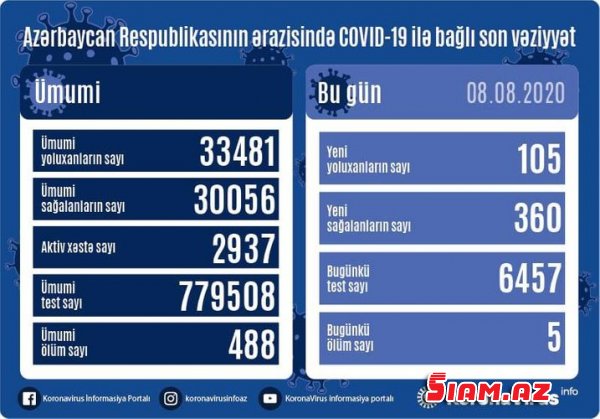Azərbaycan Respublikasında koronavirus (COVID-19) infeksiyasına 105 yeni yoluxma faktı qeydə alınıb, 360 nəfər müalicə olunaraq sağalıb və evə buraxılıb. Nazirlər Kabineti yanında Operativ Qərargahdan